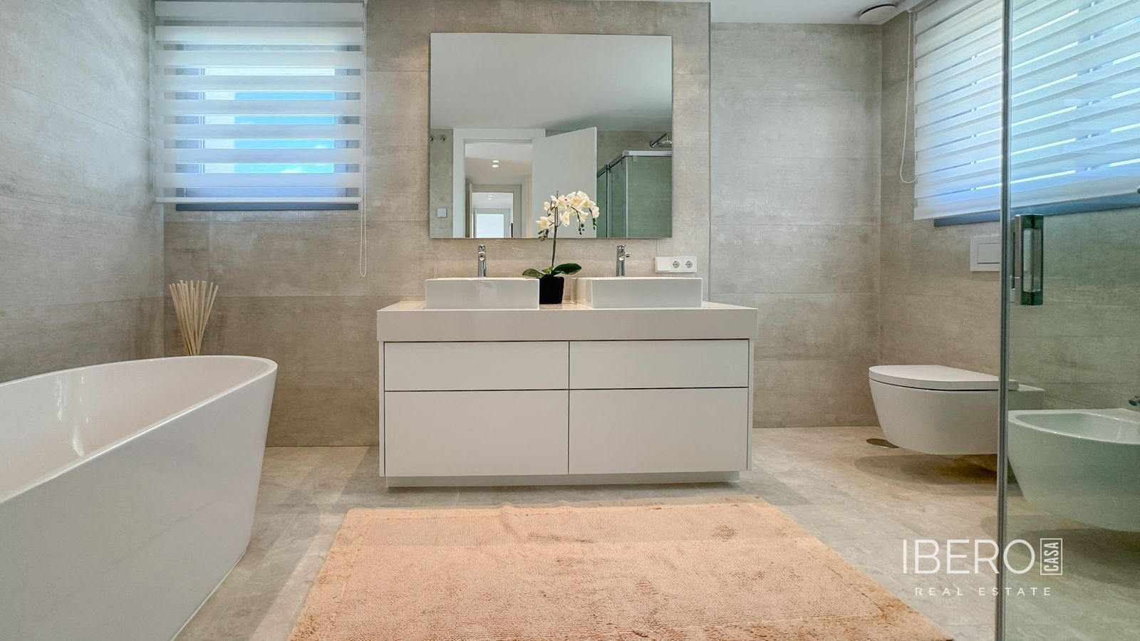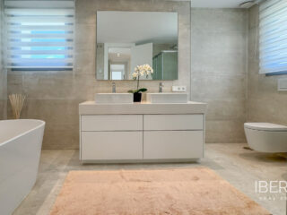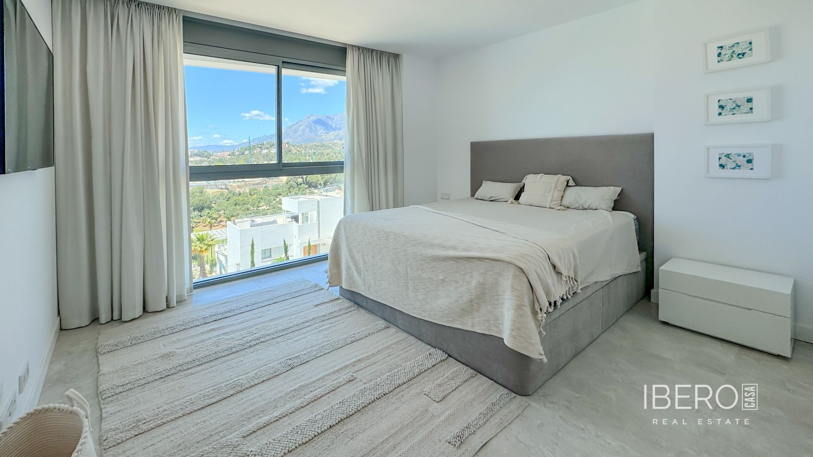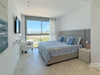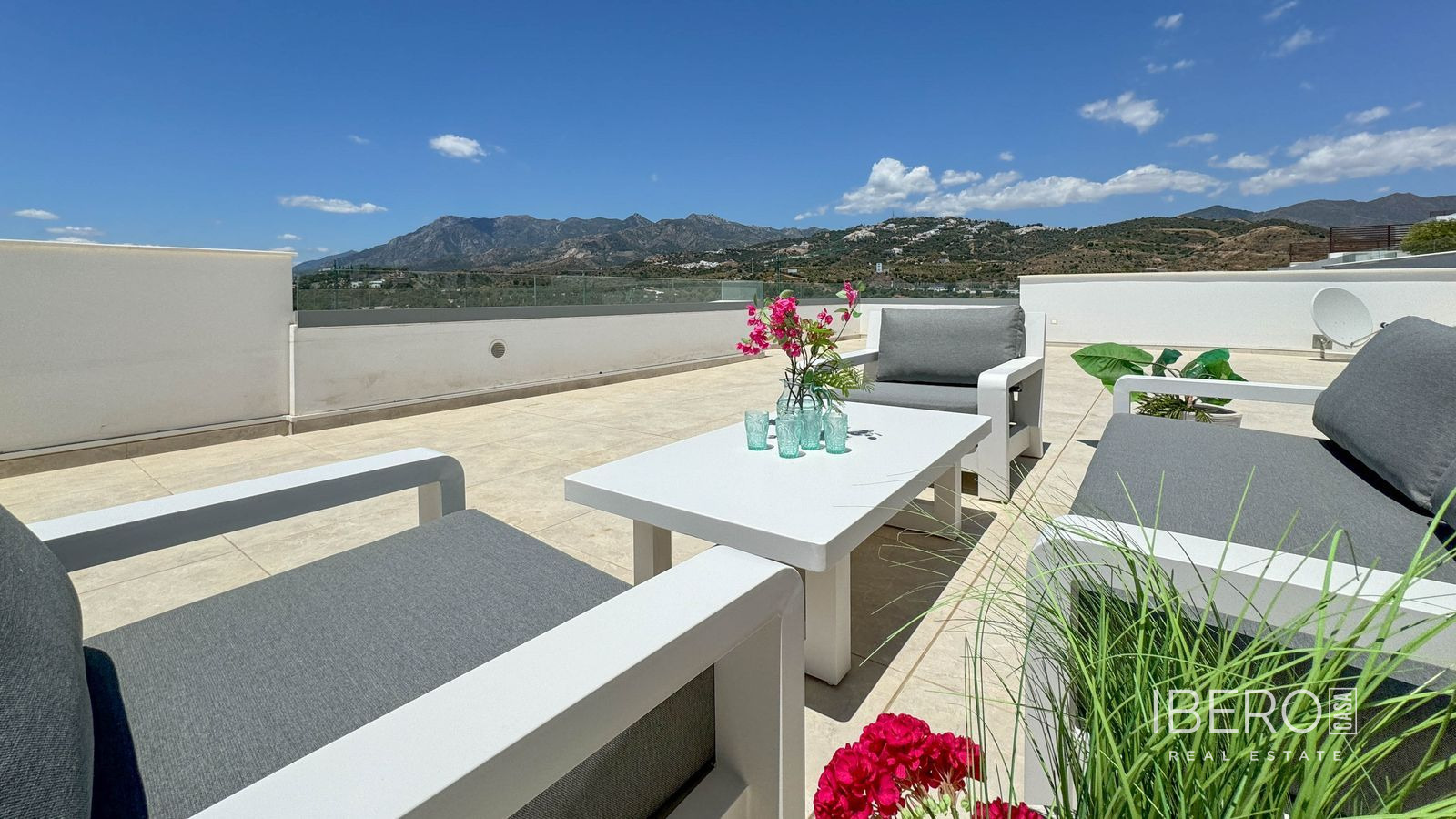 Ático dúplex contemporáneo con terraza y solárium, ambos con vistas panorámicas al mar Mediterráneo y rodeados por los fairways del campo de golf de Santa Clara El ático con orientación oeste en el campo de golf de Santa Clara le fascinará con sus pintorescas puestas de sol. Los ventanales panorámicos de suelo a techo de la sala de estar de planta abierta con comedor y cocina totalmente equipada le ofrecen una vista fantástica de las montañas y el Mediterráneo desde todos los ángulos. La terraza de 29 m2 frente a la sala de estar combina a la perfección el área interior con el área exterior, creando un ambiente de vida extremadamente espacioso y aireado. En el mismo nivel se encuentra el dormitorio principal con vistas al mar y baño en suite con bañera y ducha, así como un vestidor. También hay dos dormitorios más que comparten un baño familiar con una amplia ducha y un aseo de invitados. Lo más destacado es la magnífica azotea de 110 m2 con vistas panorámicas, que le ofrece muchas posibilidades para eventos sociales con su familia y amigos. Dentro del exclusivo complejo privado puede disfrutar de amplias instalaciones comunes para su relajación y ejercicio. Entre ellas se encuentran amplios jardines mediterráneos con 4 grandes piscinas al aire libre, tumbonas y camas chill-out, una zona lounge bar al aire libre, un spa con sauna, baño de vapor, piscina cubierta y gimnasio, así como una cafetería y un salón de coworking. - Incluye 2 plazas de aparcamiento en el garaje subterráneo y 1 trastero privado - Calefacción por suelo radiante en toda la propiedad y aire acondicionado (frío/calor) - Una casa de ensueño para vivir, trabajar y pasar unas relajantes vacaciones - Ático ideal en el sur para parejas y familias - Ubicación perfecta para golfistas - Lista para entrar a vivir de inmediato Feedback geben
